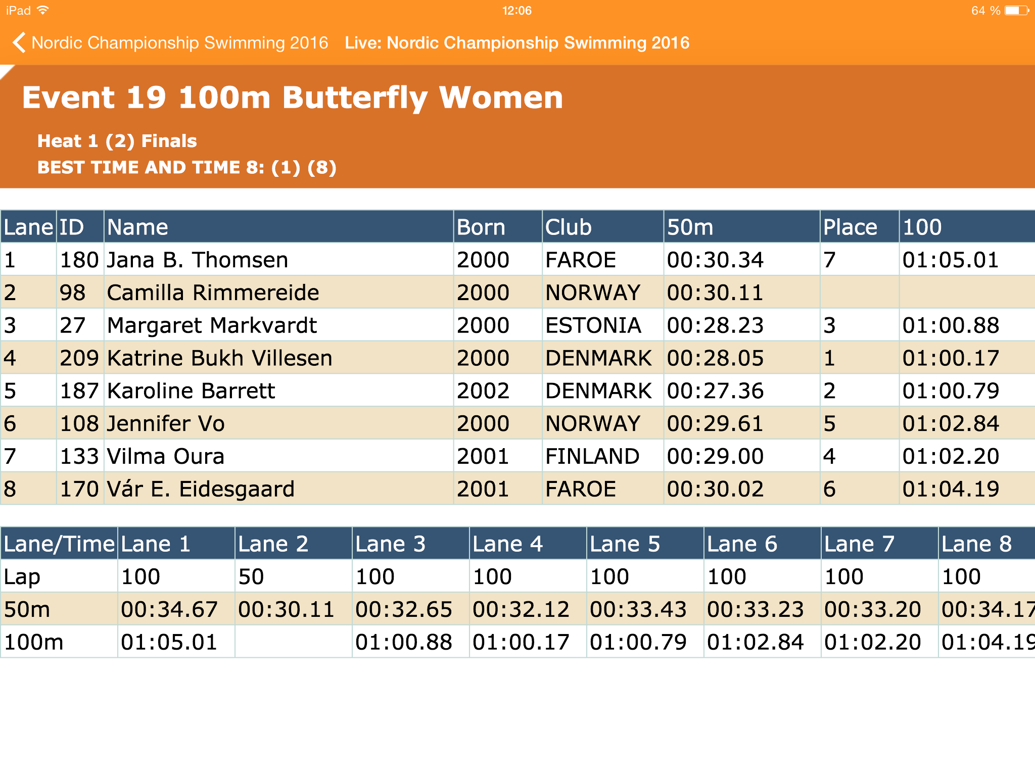 Tey avgreiddu fyri løtu síðani finalurnar í 100 firvald á NM/NJM 2016, har Vár Erlingsdóttir Eidesgaard úr Havnar Svimjifelag megnaði at gerast nr 6 við tíðini 1:04.19, meðan Jana Bjartalíð Thomsen úr Ægir varð kolldømd fyri at ójavnt innslag í vending. Besta tíð hjá Vár er 1:03.67, frá HS-stevnuni í november.