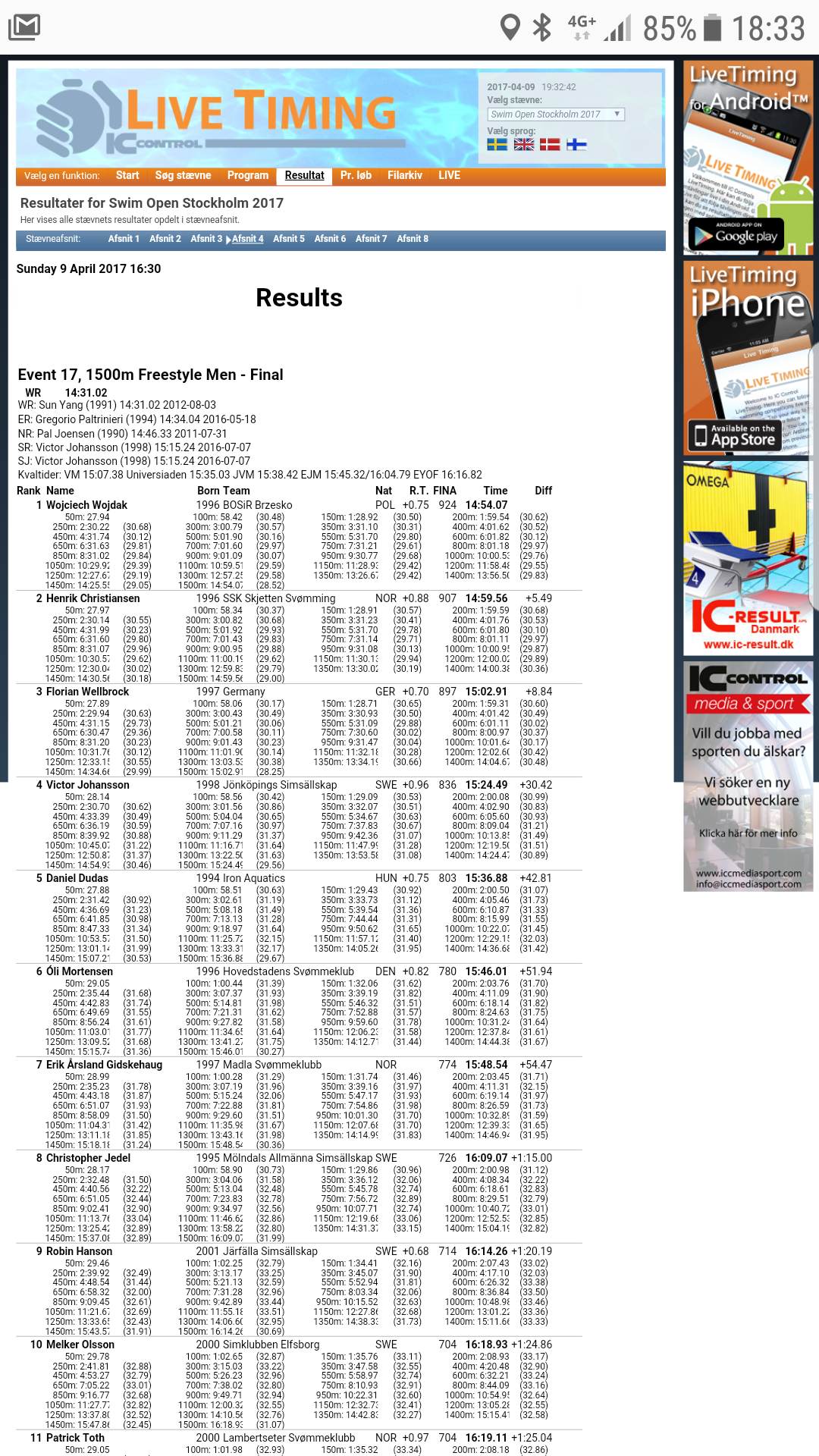Óli 15:46.01 og nr 6 í 1500 á Swim Open Stockholm 2017